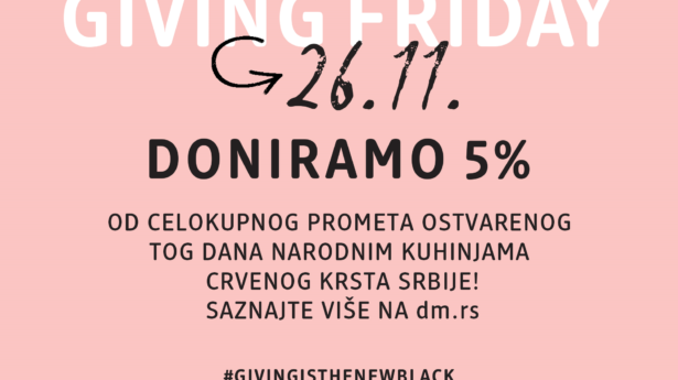 Dok se kupci širom sveta spremaju na najluđe popuste u godini na čuveni „Black Friday“, kompanija dm drogerie markt treću godinu zaredom daje novo značenje ovom danu. Tako će i ovog poslednjeg petka u novembru drogerijski lanac usmeriti pet odsto od celokuponog prometa tog dana narodnim kuhinjama Crvenog krsta Srbije.Ovaj globalno popularni dan u kompaniji dm nosi naziv Giving Friday, a navedenu inicijativu drogerijski lanac sprovodi na nivou cele dm Grupe pod sloganom Giving is the new black. Ponosni smo što je akcija Giving Friday postala naš prepoznatljiv znak i što imamo priliku da učinimo da se i naši sugrađani ovog dana osećaju dobro – jer verujemo da posebnu energiju donosi saznanje da ste određenim činom pomogli nekome. Mi to činimo svakodnevno i to je ono što nas pokreće. Zadovoljstvo nam je što imamo mogućnosti da kontinuirano doprinosimo boljitku našeg društva, kao i da skrećemo pažnju zajednice na teme koje su istinski važne. Izabrali smo ovaj dan koji simboliše potrošački mentalitet društva u celom svetu, kao priliku da pokažemo koliko je malo potrebno da nekoga usrećimo, istakla je direktorka dm drogerie markt Srbija i Severna Makedonija Alexandra Olivera Korichi.Lanac dm pokrenuo je takozvani Giving Friday 2019. godine prikupivši tri miliona dinara za opremanje Univerzitetske dečje klinike Tiršova. Prošle godine dm je u ovoj akciji usmerio tri miliona dinara narodnim kuhinjama Crvenog krsta Srbije, koje će, kao što je spomenuto, i ovoga puta dobiti podršku kompanije.