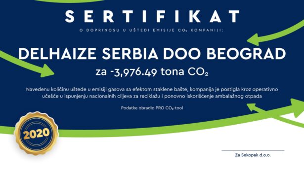 Kompanija Delez Srbija dobila je sertifikat o doprinosu uštedi emisije CO2, kojim se potvrđuje odgovoran pristup aktivnostima koje direktno utiču na očuvanje životne sredine i sprečavanje velikih klimatskih promena. Ostvareni rezultat odnosi se na 2020. godinu u kojoj je smanjena emisija ugljen-dioksida za 3,976.49 tona kroz odgovorno sakupljanje i recikliranje ambalažnog otpada.„Očuvanje životne sredine i borba protiv klimatskih promena deo je održivog poslovanja kojem smo veoma posvećeni i u okviru kojeg ostvarujemo dobre rezultate. U okviru kompanije pokrećemo različite aktivnosti koje doprinose smanjenju emisija CO2 kao što su reciklaža i smanjenja otpada. Najznačajnije rezultate smo ostvarili prelaskom na korišćenje zelene električne energije, primenom mera energetske efikasnosti i implementacijom inovativnih tehnoloških rešenja u ovoj oblasti, zahvaljujući čemu smo samo u 2020. godini za 30 odsto smanjili emisiju ugljen-dioksida u kompletnom sistemu u odnosu na 2019“, ističe Jovan Todorić, menadžer za održivost i zaštitu životne sredine kompanije Delez Srbija. Sekopak dodeljuje sertifikate kompanijama u sistemu operatera, za učinak u smanjenju emisije CO2 u atmosferu, a na bazi plasiranih i recikliranih količina ambalažnog otpada u prethodnoj godini.