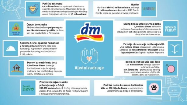 Kompanija dm drogerie markt Srbija godinu završava rekordnim donacijama, u ukupnom iznosu od 29,1 miliona dinara, od čega je 8,3 miliona dinara u novcu, dok je 20,8 miliona dinara u vidu kupovine neophodne opreme i robe.Naime, drogerijski lanac, koji važi za jednu od društveno najangažovanijih kompanija u zemlji, nastavio je da sprovodi humane aktivnosti kroz već prepoznatljive kampanje i projekte kao što su Giving Friday, Movember, humanitarni sat na otvaranjima i reotvaranjima dm drogerija i Zasadi drvo, dok je ujedno podržao brojne organizacije i grupe kroz najrazličitije vidove pomoći. Humanitarne inicijative postale su zaštitni znak kompanije dm koja, nakon uspešnih finansijskih rezultata, na kraju svake godine sumira i realizovane društveno odgovorne aktivnosti. „Ponosni smo što naše poslovne uspehe uvek prate projekti koji su važni za unapređenje sredine u kojoj živimo i poslujemo. Zato, kao neodvojiv deo našeg poslovnog uspeha stoji podrška našoj zajednici i dragim sugrađanima. U želji da uzvratimo zajednici na poverenju dugom skoro 18 godina, nastojimo da svoju poziciju na tržištu usmeravamo u cilju stvaranja pozitivnih promena u društvu, ali i oplemenjivanju pojedinaca i kompanija da budu tu jedni za druge. Naša kompanija postoji zahvaljujući ljudima i zato će u našem fokusu uvek biti čovek“, ističe Vesna Stojanović, direktorka dm Srbija i Severna Makedonija.U još jednoj godini borbe – najveća podrška zdravstvuKompanija dm je najveći deo doniranih sredstava u godini za nama izdvojila za podršku zdravstvu, čak 4,6 miliona dinara. Na tom planu, pored mnoštva bolnica u zemlji, u okviru tradicionalne kampanje Movember, dm će donirati medicinsku opremu odeljenju urologije Kliničkog centra Kragujevac u iznosu od 1,5 milion dinara, s ciljem da poboljša uslove lečenja u toj ustanovi i upozori na značaj prevencije pretežno muških bolesti, kao što su rak prostate i rak testisa.Tradicionalno drugačiji na Crni petak U protekloj godini dm je nastavio svoju sada već prepoznatljivu kampanju Giving Friday kada na Crni petak, umesto dodatne ponude popusta, izdvaja pet odsto prometa ostvarenog tog dana u humanitarne svrhe. Sredstva u iznosu od 3,5 miliona dinara, koja su prikupljena tim povodom, donirana su u vidu robne donacije narodnim kuhinjama Crvenog krsta Srbije. Ove jeseni, pokrenuta je još jedna inicijativa s ciljem smanjenja broja gladnih – kampanja „Spasimo hranu, spasimo humanost“, koju je dm podržao doniranjem namirnica u vrednosti od 2 miliona dinara. Poduhvati za bolje obrazovanje naših najmlađihVođen mišlju da je kvalitetno odrastanje dece jedan od koraka ka boljoj budućnosti za sve nas, lanac dm drogerija u 2021. godini donirao je 3,4 miliona dinara obrazovnim ustanovama, dok je ukupno 1,8 milion dinara uputio institucijama koje zbrinjavaju mališane bez roditeljskog staranja. Kada je reč o stvaranju boljeg sveta za naše najmlađe, dm je u godini za nama sklopio još jednu značajnu saradnju – i to s Novak Đoković Fondacijom, u cilju rekonstrukcije, adaptiranja i opremanja vrtića u Topoli i Velikom Popoviću.Još jedna važna donacija odnosi se na poboljšanje svakodnevice dece obolele od raka i njihovih roditelja i oslikava se kroz dm-ovu višegodišnju podršku NURDOR-u, kojem je kompanija ove godine uputila skoro 3 miliona dinara za kupovinu neophodnog vozila za prevoz mališana.Takođe, kompanija je sprovela i akciju Čepom do osmeha, u kojoj je od sakupljenih čepova tokom 2021. godine u dm drogerijama obezbeđeno ukupno pet pomagala kao i kombinovano igralište za decu i za decu sa invaliditetom u Pivnicama.Borba za svet koji više ceni ženeTradicionalna podrška kompanije sigurnim kućama širom Srbije nastavljena je i ove godine, kada je žrtvama porodičnog nasilja donirana roba u vrednosti od 2,5 miliona dinara. Kao dodatni vid podrške ženama, simbolično 8. marta, kada se obeležava Dan žena, kompanija dm je pružila podršku Zavodu za transfuziju krvi.Kada je u pitanju podrška pripadnicama ženskog pola, kompanija dm je ove godine postala i naslovni sponzor dm Ženske trke, u organizaciji Beogradskog maratona, promovišući zdrav život, značaj bavljenja fizičkom aktivnošću, brojne načine primarne zdravstvene prevencije kod ženske populacije, ali i ekološke alternative za kvalitetnije životno okruženje svih nas. Ujedno, trka je bila značajna i zbog obezbeđenih uslova za učešće žena s invaliditetom, na koje se odazvalo više od 50 žena. Predvodnik najveće akcije pošumljavanja u SrbijiPotvrđujući epitet jedne od najzelenijih kompanija u zemlji, dm je ove godine otvorio i treći ciklus projekta Zasadi drvo, koji sprovodi s Adria Media Groupom i institucionalnim partnerima, a postavljeni cilj je sadnja čak 200.000 sadnica, što je dvostruo više nego prethodne godine. Posebna podrška našim krznenim ljubimcimaUjedno, kako bi svet učinila boljim mestom, ne samo za ljude nego i za naše krznene prijatelje, kompanija dm je usmerila donaciju u proizvodima u iznosu od preko 680 hiljada dinara udruženjima za životinje kako bi im se ukazala neophodna pomoć. Odgovorni jedni prema drugima Drogerijski lanac dm, pionir brojnih humanih inicijativa, ostaje dosledan cilju da svakodnevno doprinosi zajednici, trudeći se da služi kao primer dobrog poslovanja i društveno odgovornog delovanja. Zato iz kompanije poručuju da je pravi uspeh onda kada se deli, kada ne zaboravljamo na ljude oko nas i kada smo uz njih onda kada je to najpotrebnije.