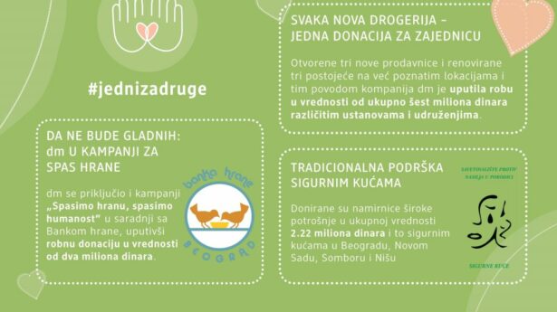 Jedna od društveno najangažovanijih kompanija u zemlji, lanac dm drogerie markt, nastavlja da sprovodi tradicionalne kampanje podrške najrazličitijim društvenim grupama, ali i da pokreće nove poduhvate usmerene na izgradnju srećnije zajednice. Tako je, u roku od samo mesec dana, dm uputio 10,22 miliona dinara različitim udruženjima i organizacijama. Svaka nova drogerija – jedna donacija za zajednicuDrogerijiski lanac kroz svako otvaranje i reotvaranje drogerija u okviru tradicionalne akcije „humanitarni sat“ donira sredstva kao vid podrške okruženju u kojem posluje. Kompanija je tako otvorila tri nove prodavnice i renovirala tri postojeće na već poznatim lokacijama i tim povodom uputila robu u vrednosti od ukupno šest miliona dinara različitim ustanovama i udruženjima. Roba u iznosu od po milion dinara donirana je Domu za decu i omladinu ometenu u razvoju „Veternik“, Školi za osnovno i srednje obrazovanje „Mladost“ u Pirotu, Školi za učenike oštećenog vida „Veljko Ramadanović“ u Zemunu, zatim Udruženju paraplegičara i kvadriplegičara „Kraguj“ iz Kragujevca, Nacionalnom udruženju roditelja dece obolele od raka – NURDOR, kao i Opštoj bolnici „Vršac“.Nove drogerije kupci mogu da posete u Cara Lazara 11 u Futogu, u Puls Shopping Parku u Pirotu, kao i u Zemunu na adresi 22. oktobra 7, koja je ujedno 113. otvorena dm prodavnica. Dve renovirane dm prodavnice su na već poznatim adresama - Doktora Zorana Đinđića 13 u Kragujevcu, Trg Majke Jevrosime 21 u Novom Sadu i reotvorena drogerija sa promenjenom lokacijom koju sada kupci mogu da posete na Trgu pobede 7 u Vršcu. Da ne bude gladnih: dm u kampanji za spas hraneOve jeseni, dm se priključio i kampanji „Spasimo hranu, spasimo humanost“ u saradnji sa Bankom hrane, uputivši robnu donaciju u vrednosti od dva miliona dinara. Plemenit cilj da se prikupi hrana za više stotina hiljada gladnih građana Srbije okupio je i ostale brojne nevladine organizacije, kompanije i medijske kuće koje su udruženo donirale namirnice. „Kompanija dm uspešno posluje na teritoriji Srbije skoro 18 godina, a mi se konstantno trudimo da zajednici uzvratimo na dugogodišnjem poverenju tako što pokrećemo brojne humanitarne akcije i društveno odgovorne projekte kroz koje doprinosimo konkretnim promenama. Drogerijski lanac će da nastavi sa humanitarnim akcijama vodeći se porukom „Čovek u centru poslovanja“, rekla je Svetlana Jovanović-Mitić, menadžerka marketinga u kompaniji dm drogerie markt Srbija.Tradicionalna podrška sigurnim kućama Ovaj period jesenjeg darivanja dm je zaokružio robnom donacijom sigurnim kućama Srbije u cilju pružanja pomoći i podrške žrtvama porodičnog nasilja. Donirane su namirnice široke potrošnje u ukupnoj vrednosti od 2,22 miliona dinara i to sigurnim kućama u Beogradu, Novom Sadu, Somboru i Nišu, dok se u narednim mesecima nastavlja donacija i drugim sigurnim kućama u zemlji. U još jednoj uspešnoj godini, dm nastavlja da širi svoju mrežu poslovanja i vezu sa kupcima u brojnim gradovima Srbije, uz poseban akcenat na filantropske aktivnosti. Iz kompanije poručuju da će da nastave da neguju poslovnu filozofiju zasnovanu na humanim principima i kontinuiranom investiranju u društveno-ekonomski razvoj zemlje.