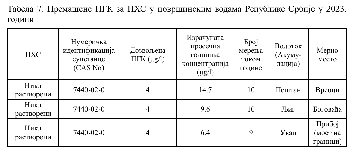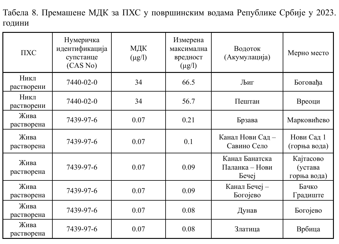 Tako je analiza površinskih voda u 2023. godini, koja je urađena na 80 mernih mesta na 56 vodotokova i šest mernih mesta na dve akumulacije pokazala da su supstance koje izazivaju dugoročne posledice po ekosisteme premašene na tri merna mesta na tri vodotoka u Srbiji.