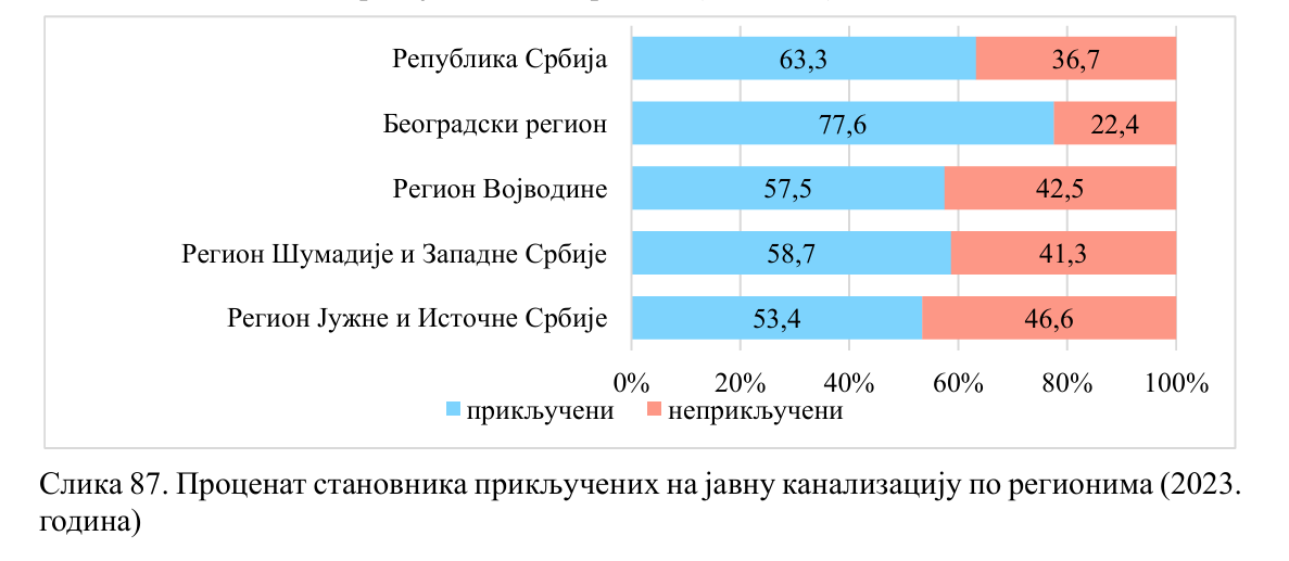 Procenat stanovnika priključenih na javnu kanalizaciju u Srbiji u 2023. godini iznosi 63,3 odsto, pokazuju podaci Agencije za zaštitu životne sredine. Najveća priključenost je u Beogradskom regionu, a najmanja u regionu Južne i Istočne Srbije.