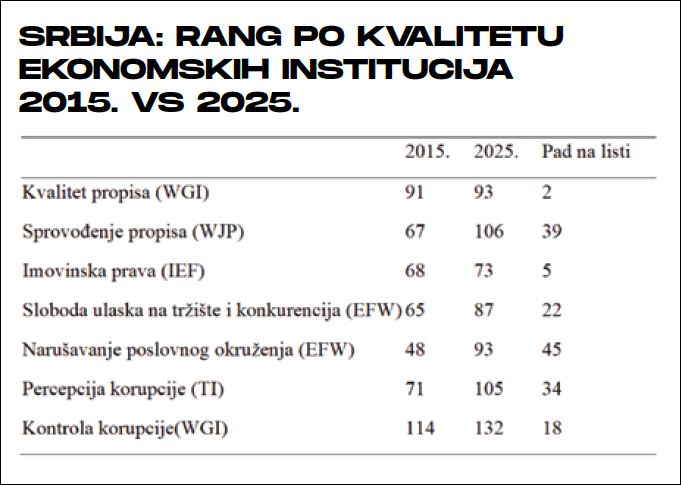 Srbija ima neefikasne ekonomske institucije – iskrivljena „pravila igre“, koje sputavaju razmah domaćeg privatnog sektora. Stepen vladavine prava (kvalitet propisa, sprovođenje propisa, zaštita imovinskih prava) je nizak i sistematski se pogoršava. Ista je stvar sa pravilima koja određuju konkurenciju, slobodu ulaska na tržište i šire kvalitet poslovnog okruženja. Najzad, korupcija je veoma visoka. (Grafikon 2 i tabela)