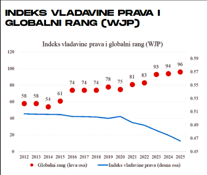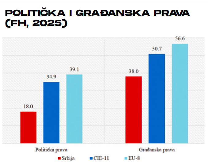 Na ogromnu koncentraciju političke moći u Srbiji jasno ukazuje brojni međunarodni pokazatelji. Ukupne slobode naglo padaju od 2015. i Srbija od 2019. pada u hibridni režim – delimično slobodna zemlja (grafikon 3). Iza iznetog pada stoji urušavanje političkih sloboda (izborni proces, politički pluralizam, kako se upravlja posle izbora) i snažno narušavanje građanskih sloboda (medijske i akademske slobode, nezavisnost pravosuđa). (Grafikon 4)