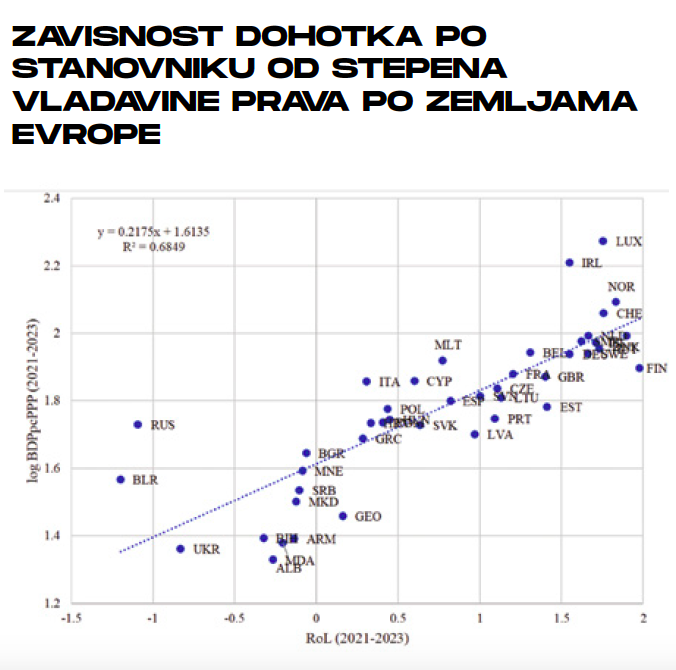 Zemlje sa visokim stepenom vladavine prava (horizontalna osa na grafikonu 1), kao indikatorom poštovanja pravila igre, su ujedno i one koje imaju najveći dohodak po stanovniku, na primer razvijena Evropa, dok one sa niskim nivoom vladavine prava – Zapadni Balkan, uključujući Srbiju, zatim Moldavija, Jermenija itd, imaju nizak dohodak. Ovu pravilnost koju sam pokazao na priloženom grafikonu za zemlje Evrope, Adžemoglu je demonstrirao na znatno većim uzorcima zemalja sveta i uz to pokazao da uzročnost ide od stepena efikasnosti institucija ka veličini dohotka po stanovniku. Još važnije pokazao je da su dobra ekonomska pravila po kojima se igra presudna za brz tehnički progres, što znači za dugoročan rast zasnovan na znanju. Prethodno, po svemu sudeći važi i za zemlje Evrope, tj. takođe smo dobili pozitivnu vezu između stepena vladavine prava i nivo tehničkog progresa.