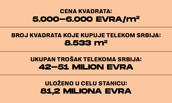 Prema našim izvorima, kvadrat u ovim objektima prodat je po ceni od 5.000 do 6.000 evra u sivoj fazi. Ukoliko je plaćena niža cena za dva objekta koja je kupio Telekom Srbija, ukupna cena iznosi 42, 7 miliona evra, a za višu cenu 51,2 miliona evra.