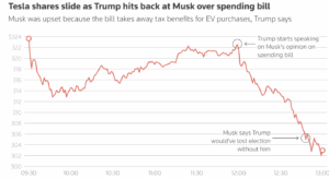 Sukob dva prijatelja, Donalda Trampa i Ilon Maska, uticao je na nagli pad akcija kompanije Tesla. Akcije su u padu od 14 odsto, odnosno tržišna vrednost je opala za 150 milijardi dolara.