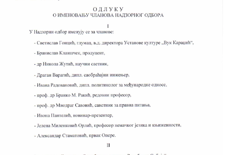 Na predlog poslaničke grupe SNS, izbore će nadzirati glumac i vd direktor Ustanove kulture Vuk Karadžić, Svetislav Goncić. Na predlog poslaničke grupe ADA LSV SDA Sandžaka u nadzornom odboru biće producent Branislav Klanšček, dok je Stranka moderne Srbije predložila Dragana Varagića. Srpska radikalna stranka predložila je dr Nikolu Žutića.
