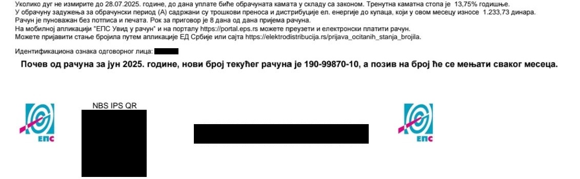 U računima se navodi da je novi broj tekućeg računa 190-99870-10. Zanimljivo je da se ovaj račun vodi u privatnoj Alta banci, za razliku od dosadašnjeg trezororskog računa, a EPS nije dao objašnjenje za ovu promenu.