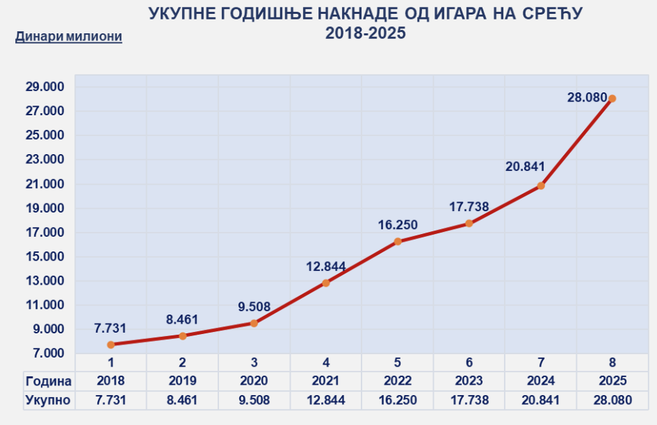 Prema poslednjim podacima Uprave za igre na sreću, samo u 2025. godini, kladionice i drugi priređivači igara na sreću su u budžet Srbije, kroz različite oblike nameta, uplatili više od 28 milijardi dinara. Ovaj iznos obuhvata naknade za organizovanje klađenja, elektronskog klađenja, igre na automatima…