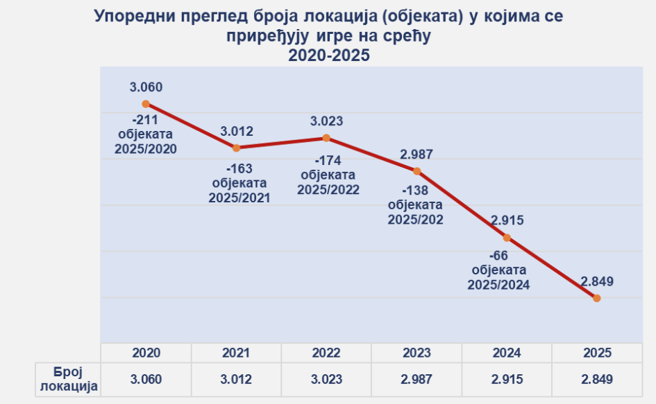 S druge strane, tokom prethodnih godina beleži se pad broja kladionica i sličnih objekata. Naime, poslednjeg dana 2025, u Srbiji je poslovalo 2.849 kladionica – 66 manje nego u 2024. A i u 2024, u kojoj je poslovalo 2.915 kladionica, takođe je zabeležen pad, baš kao i u 2023.