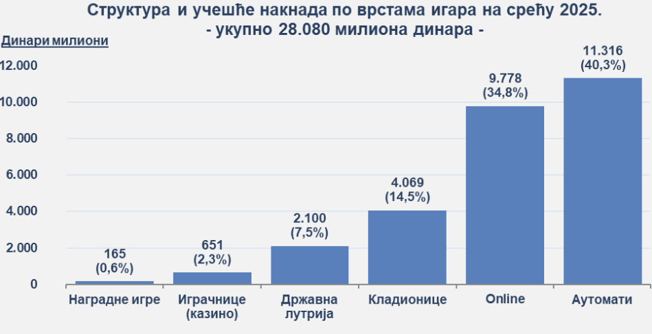 Najveći udeo u ovom iznosu imaju automati, čak 40,3 odsto. Slede onlajn klađenje (34,8 odsto), kladionice (14,5), Državna lutrija (7,5), kazino (2,3) i nagradne igre (0,6).