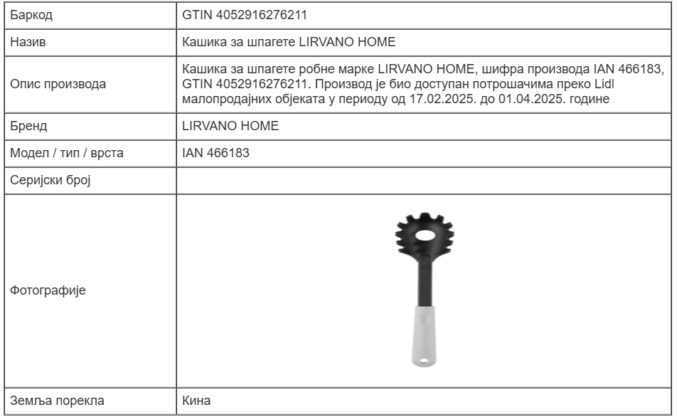 Sa tržišta u Srbiji se povlači kašika za špagete robne marke LIRVANO HOME, objavljeno je na sajtu sistema NEPRO (Nacionalna baza i sistem upozoravanja o nebezbednim neprehrambenim proizvodima).