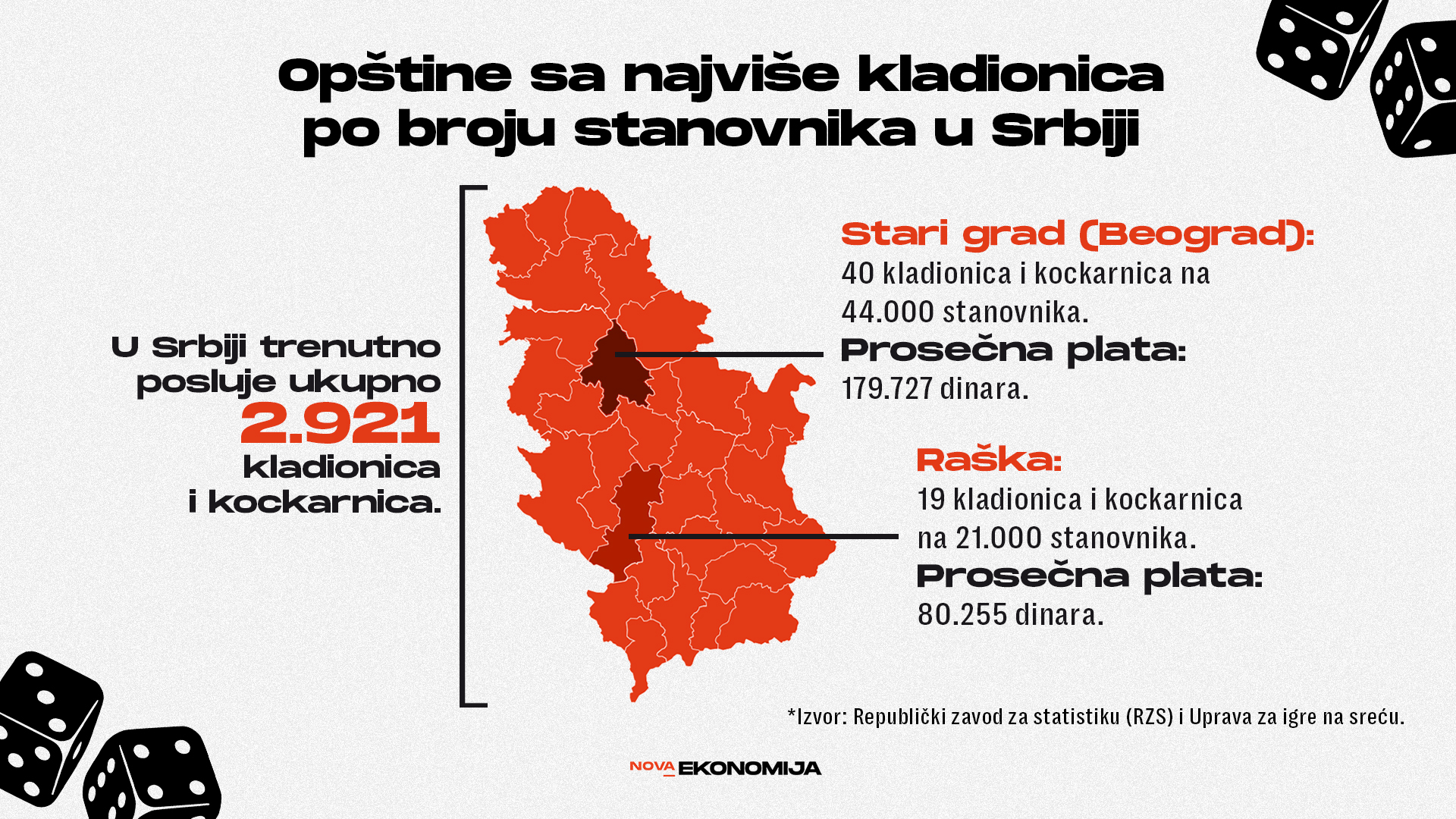 U Srbiji trenutno posluje ukupno 2.921 kladionica i kockarnica. Najviše ih, po glavi stanovnika, ima u centralnoj beogradskoj opštini Stari grad. Otvoreno je, naime, 40 kladionica i kockarnica, na oko 44.000 stanovnika.