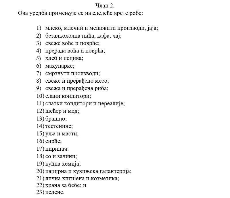Ograničenje marže odnosi se na 23 grupe proizvoda. Tu spadaju mleko i mlečni proizvodi, jaja, bezalkoholna pića, kafa i čaj, sveže i prerađeno voće i povrće, mahunarke, hleb i peciva. Marže neće smeti da budu veće od 20 odsto ni kod smrznutih proizvoda, svežeg i prerađenog mesa i ribe, kao ni kod slatkiša i grickalica. Potom, uredbom su obuhvaćeni i šećer, med, brašno, testenine, ulja, sirće, pirinač.