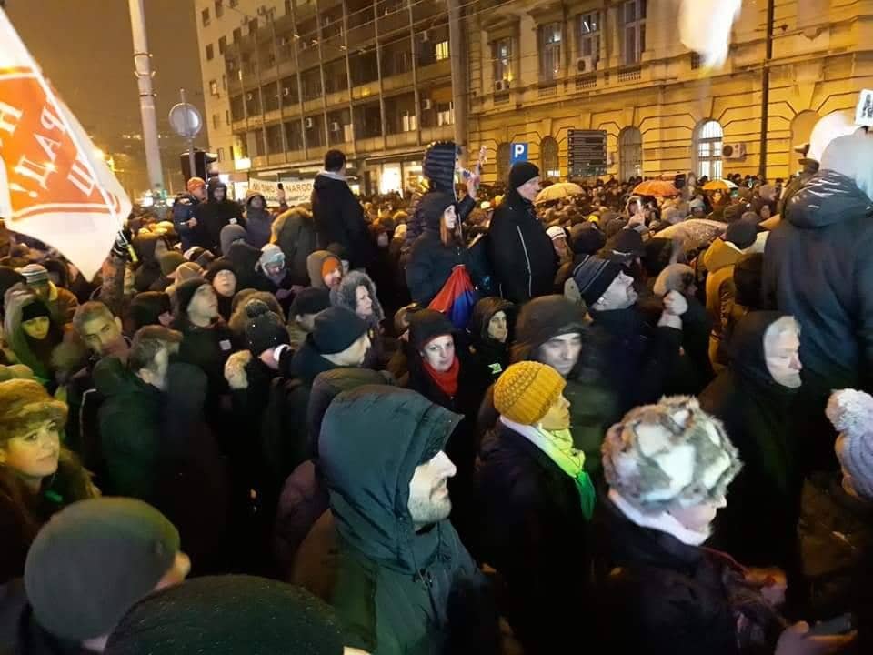 Okupljeni su nosili srpske zastave, transparente „Počelo je“, „Ti brojiš, mi odbrojavamo“, duvali su u pištaljke i trube.