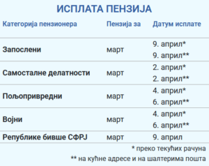 Najveći deo penzionera, oni koji su otišli u penziju kao zaposleni će dobiti penzije 9. aprila, a istog dana će biti isplaćene i penzije u republikama bivše SFRJ.