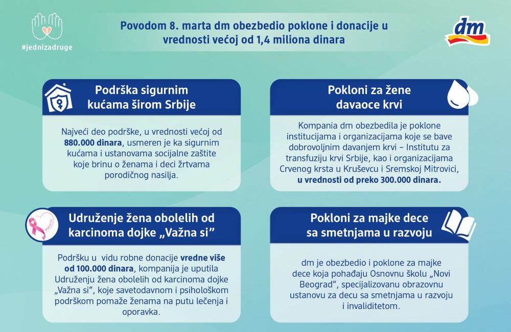 Ovim donacijama dm još jednom potvrđuje posvećenost ideji da Dan žena bude više od simboličnog obeležavanja – prilika da se pažnja i podrška pretvore u konkretna dela i stvarnu, vidljivu pomoć ženama širom Srbije.