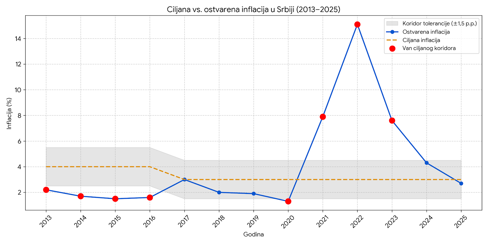 Inflacija u Srbiji je jedino u 2017. godini bila blizu cilja koji je zacrtala NBS kada je ostvarila rast od 3,1 odsto. Ekonomisti ne gledaju blagonaklono ni kada je inflacija mnogo ispod cilja jer to može oslikavati neke druge ekonomske probleme u državi. U 2022. godine počeo je rat u Ukrajini koji je doneo inflaciju od 12 odsto. Od tada, Srbija ne može da se izbori sa rastom cena, pa je narednih pet godina NBS potpuno mašila u postizanju svog cilja od 3 plus, minus 1,5 odsto. U 2025, sve do avgusta, indeks potrošačkih cena se kretao između četiri i pet odsto, osim u jednom mesecu. Tek u poslednje vreme posle uvedenih mera ograničenja marži, rast cena je donekle umiren i u januaru je bio na 2,4 odsto.