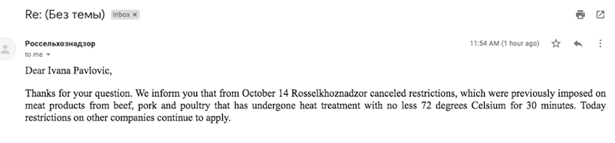 U saopštenju kompanije Zlatiborac, povodom ukidanja zabrane navode da su odmah po stupanja na snagu zabrane, otpočeli sa intenzivnim radom na otklanjanju neusaglašenosti, koje su se odnosile na procedure i normativno-tehničke uslove, a koje je evidentirala Federalna služba za veterinarski i fitosanitarni nadzor Ruske Federacije.
